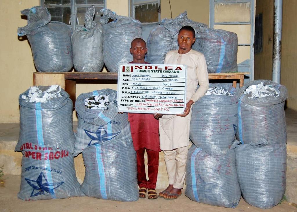 In Kogi state, a total of 530,160 pills of tramadol and 99,000 tabs of diazepam were seized along Okene-Abuja highway from a bus driver, Suleiman Oyedokun, 41, coming from Onitsha, Anambra state and going to Kontagora in Niger State on Monday 13th March. Same day, 576, 100 pills of tramadol concealed in bags of rubber slippers were intercepted by NDLEA officers at trailer garage, old mile 3 road area of Gombe metropolis, Akko LGA, Gombe State. Four suspects: Usman Suleiman; Ya’u Yusuf; Saidu Suleiman and Abubakar Umar have so far been arrested in connection with the seizure.
