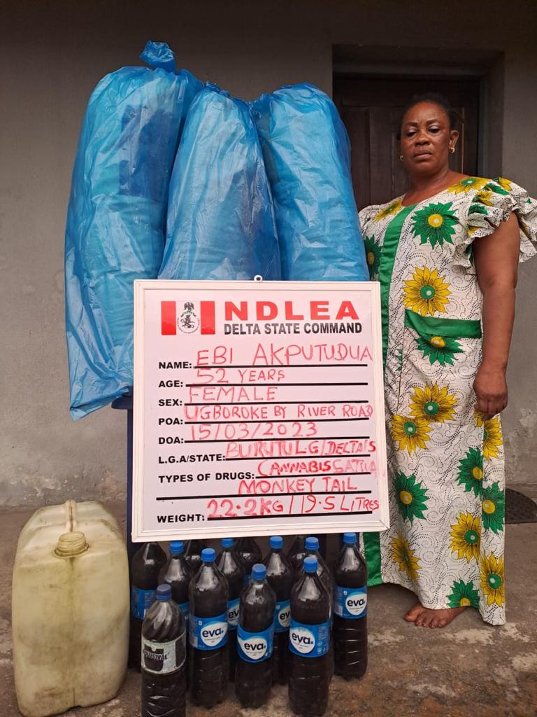 Operatives in Delta state also on Wednesday 15th March arrested a local female distiller of cannabis sativa and dry gin, Ebi Akpotudua, 52, to produce a cocktail drink popularly known as monkey tail. She was arrested at Ugboroke by river road, Warri with 19.5 litres of monkey tail and 22.2kg cannabis.