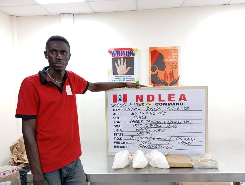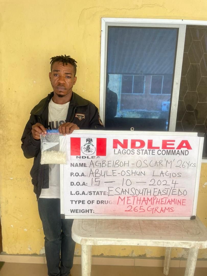 A suspected meth cook, Agbeiboh Oscar, was nabbed same Tuesday at Abule Osun with 265grams of methamphetamine and different quantities of precursor chemicals for the manufacture of methamphetamine and others.