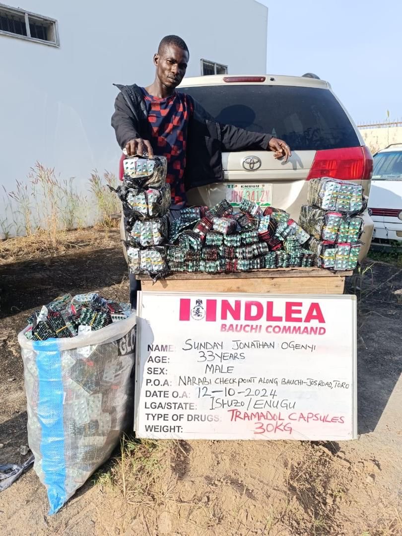 In Bauchi state, a suspect Sunday Jonathan Ogenyi, 33, was arrested along Bauchi-Jos road with 76,600 pills of tramadol concealed in false compartments of his Toyota Sienna vehicle marked Enugu JRV 341 ZY, while NDLEA operatives in Ondo state on Tuesday 15th October arrested three suspects: Goddey Obizuo; Samuel Aniete; and Kuffrey Aniete at Afo village where 672kg cannabis sativa was seized from them.