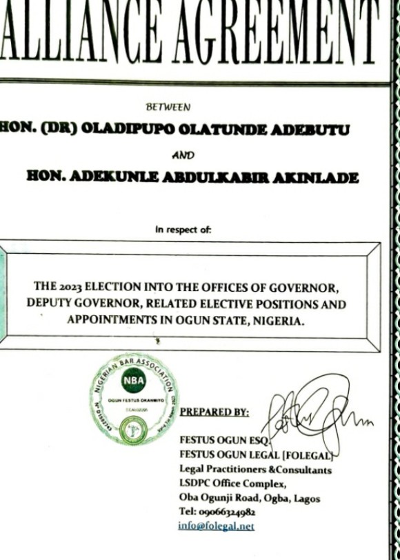 A secret agreement signed by both the governorship candidate of the Peoples Democratic Party (PDP) in Ogun State, Hon. Ladi Adebutu and the party’s Deputy Governorship Candidate in the state, Hon. Adekunle Akinlade showing that the alliance was more about sharing the resources of Ogun State rather than for the good of the state has been leaked to the media as the 2023 general elections are fast approaching.