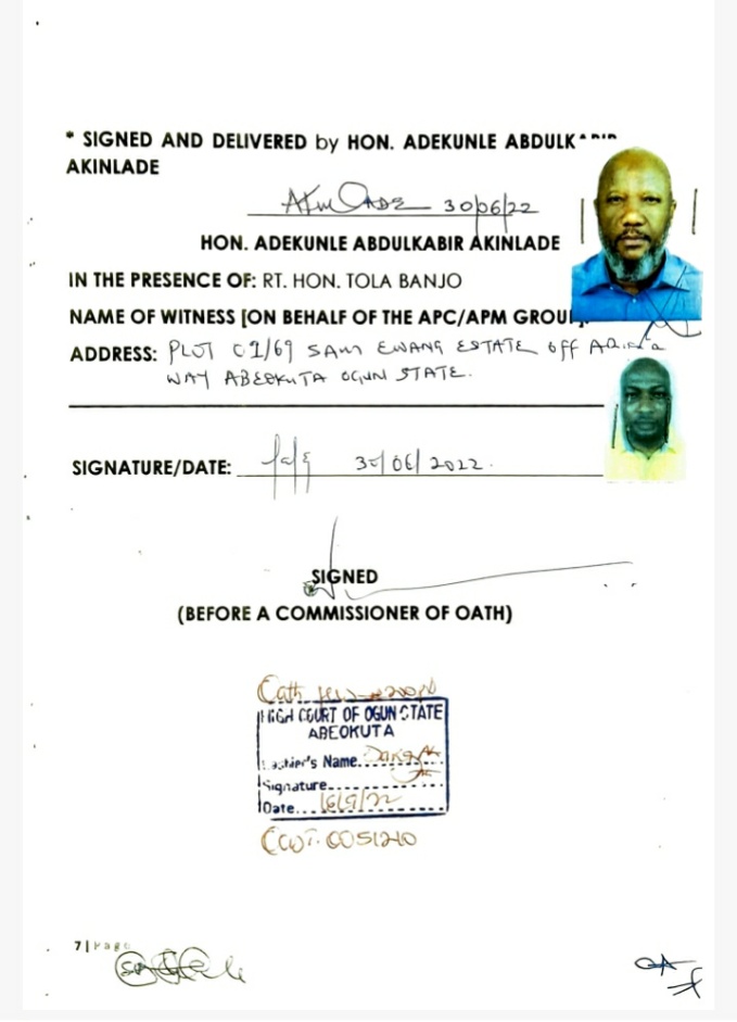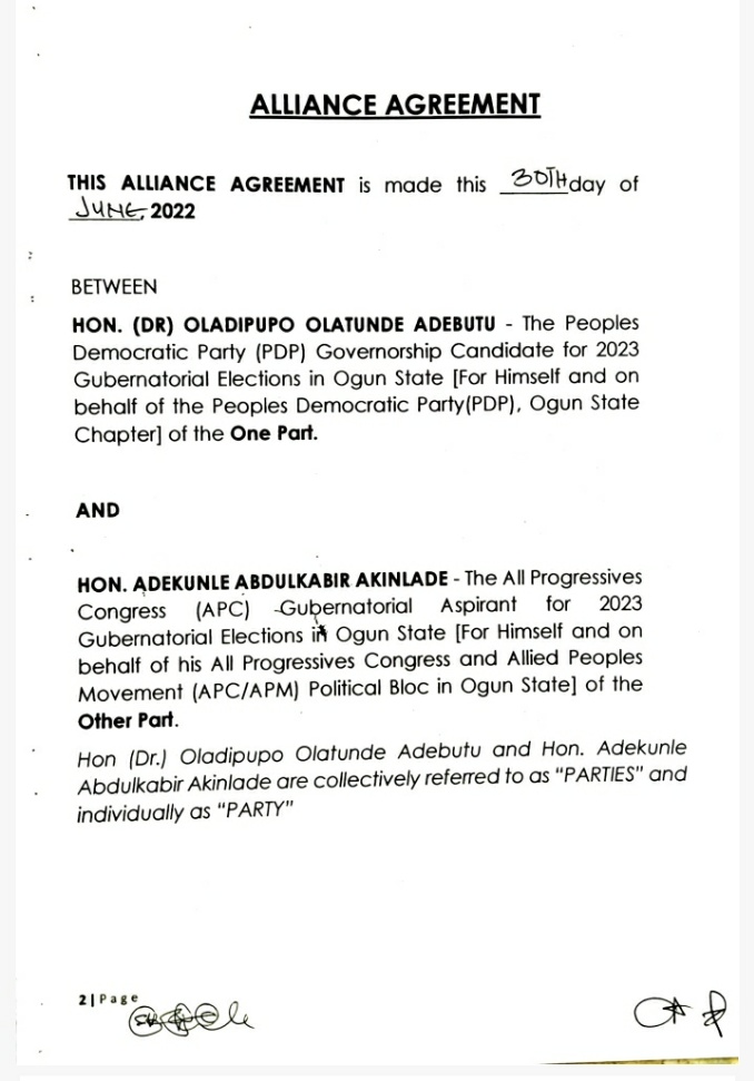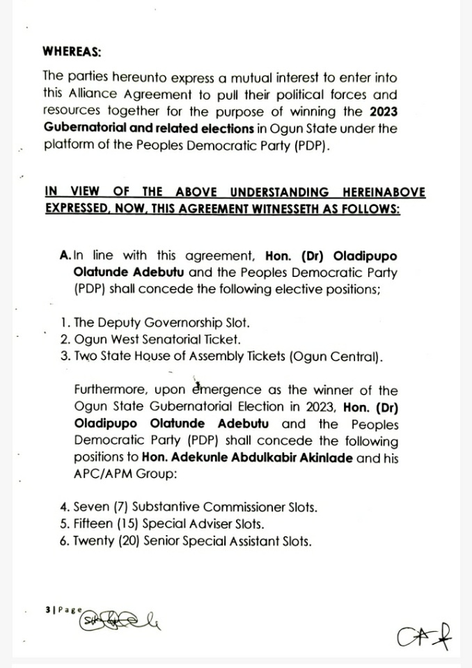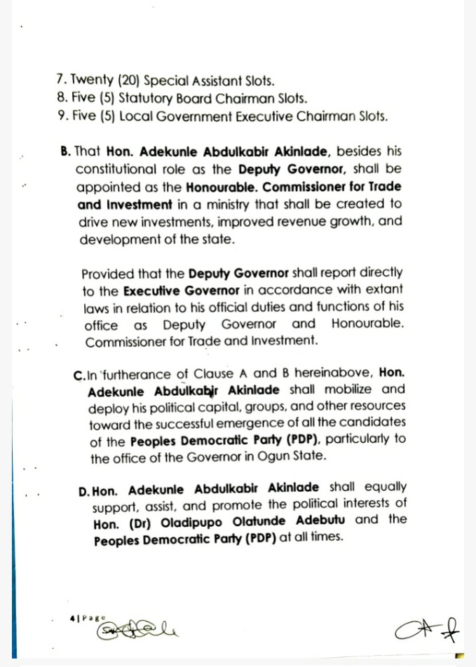 The document further read that upon emergence as the winner of the Ogun State Gubernatorial Election in 2023, Adebutu and the PDP would concede the following positions to Hon. Adekunle Abdulkabir Akinlade and his APC/APM Group: Seven (7) Substantive Commissioner Slots, Fifteen (15) Special Adviser Slots, Twenty (20) Senior Special Assistant Slots, Twenty (20) Special Assistant Slot, Five (5) Statutory Board Chairman Slots, Five (5) Local Government Executive Chairman Slots.