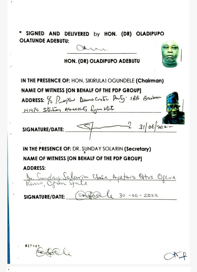 “Hon. Adekunle Abdulkabir Akinlade shall equally support, assist, and promote the political interests of Hon. (Dr.) Oladipupo Olatunde Adebutu and the Peoples Democratic Party (PDP) at all times.