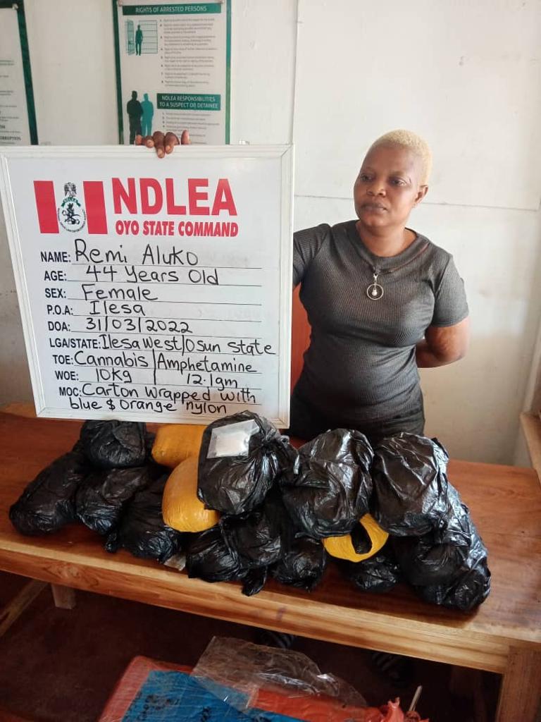 In Oyo state, 17.6kg cannabis was transferred along with a suspect, Ramon Dauda, 40, to the state command of NDLEA by the Oyo/Osun Area Command of Nigerian Customs Service, just as narcotic officers on patrol along Lagos-Ibadan expressway on Thursday 31st March intercepted a consignment of 10kg cannabis and 12.1grams of amphetamine in a commercial bus. A follow up operation in Ilesa, Osun state led to the arrest of the owner of the drug exhibits, Mrs Remi Aluko, 44.