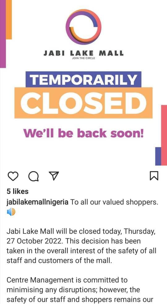 Abuja popular Mall, Jabi Lake has announced its closure to customers from today, Thursday, October 27, 2022.