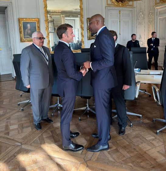 Aigboje Aig-Imoukhuede having a handshake and a tête-à-tête with President Macron at the Council’s meeting with the President, and Gilbert Chagoury looking on.