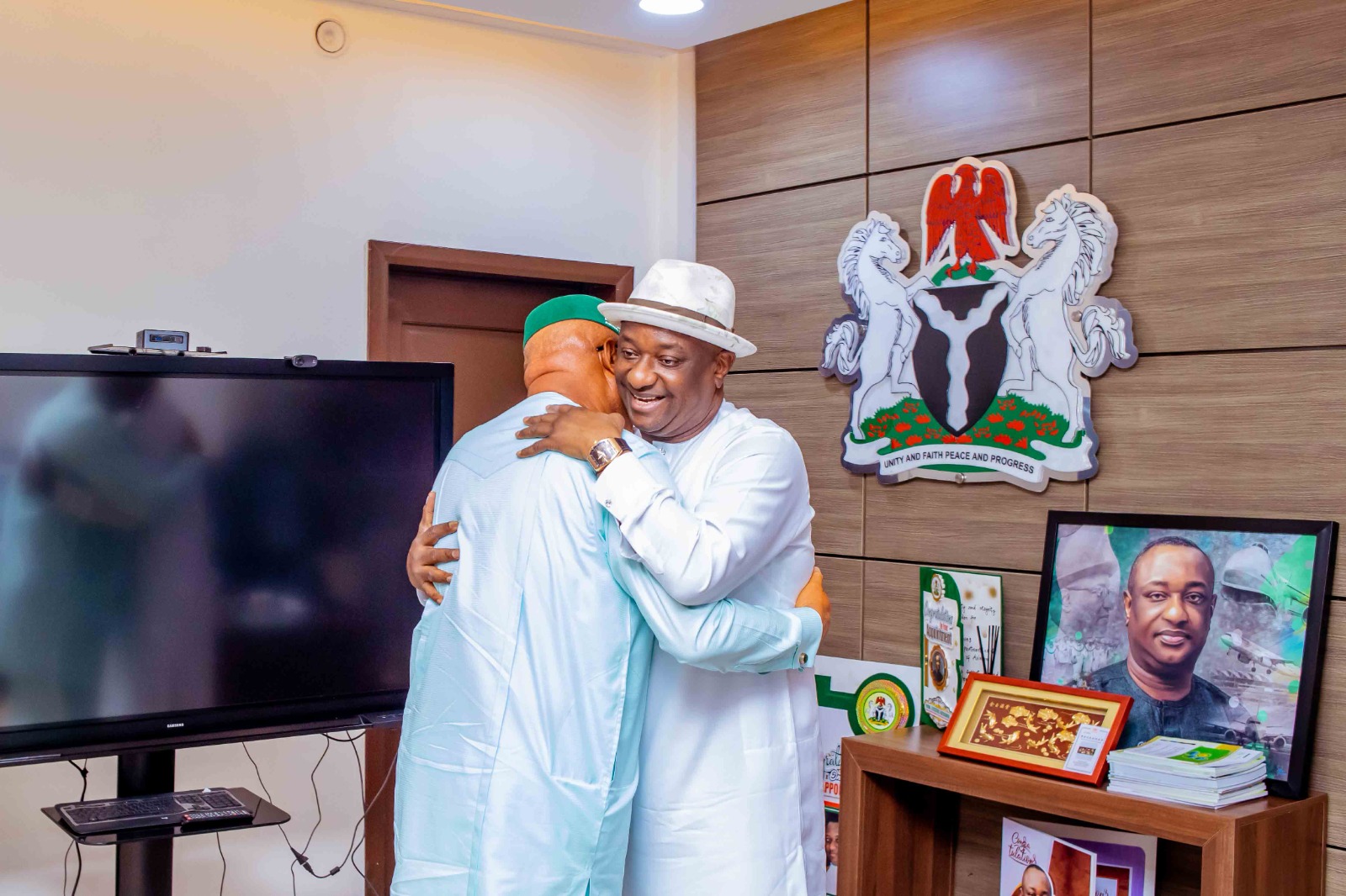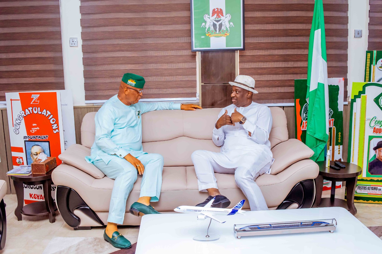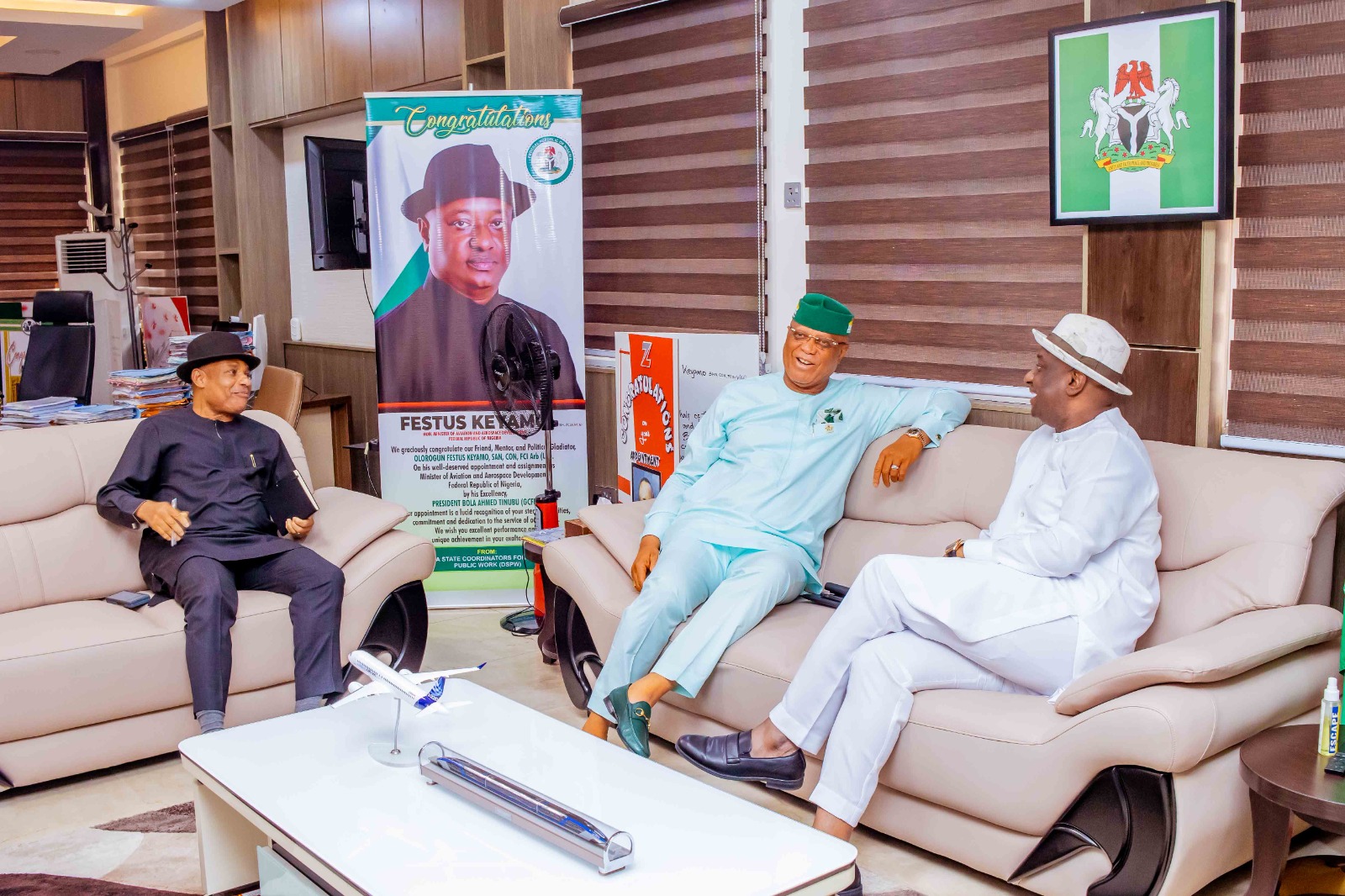 The Governor of Akwa Ibom State, Uno Udom Bassey Emmanuel, on Friday visited the Minister of Aviation and Aerospace Development, Mr Festus Keyamo, in his office to brief him on the state’s investments, Ibom Air operated by Akwa Ibom Investment Corporation (AKICORP).