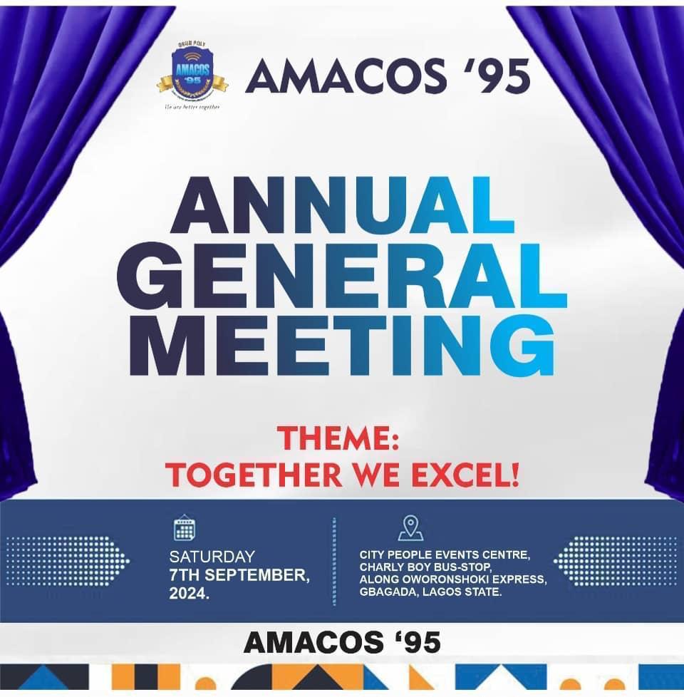 The 1995 Class of the Association of Mass Communication Students (AMACOS ‘95) of the former Ogun State Polytechnic, now Moshood Abiola Polytechnic, Abeokuta, will hold her 4th Annual General Meeting (AGM) this Saturday, September 7.