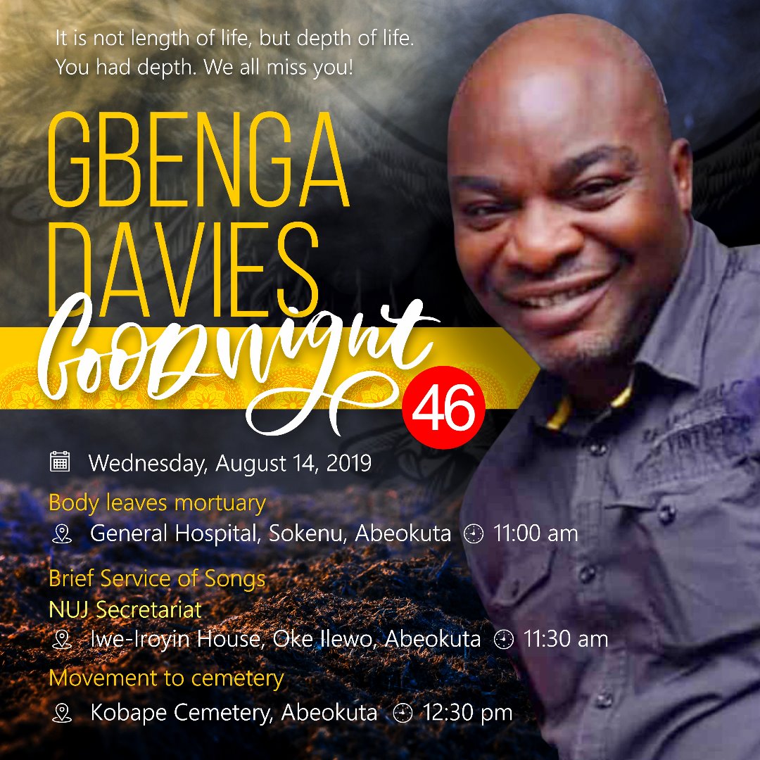 The remains of Gbenga Davies, the brother of the popular and award winning veteran journalist, Otunba Femi Davies, would be buried in Abeokuta, Ogun State, tomorrow, the August 14th, 2019.
