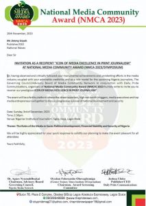 According to the letter sent to the media practitioner by the organiser of the event and signed by the Chairman Advisory Board Governing Council, Nigeria Media Network in conjunction with Daily Pride Communications, Dr. Agnes NyumahBokai and others, the award was conferred on the National Waves boss on account of his untainted years of experience and for great achievements vis a vis rising to the zenith of the Journalism profession through the dint of hard work and doggedness.
