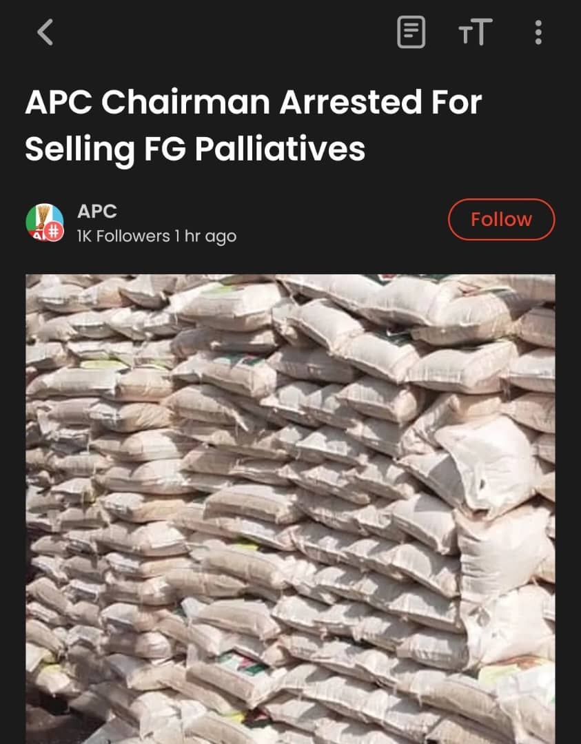 The Ward Chairman of the All Progressives Congress, APC, in Ejemekwuru Oguta LGA Imo State, Dominic Ikpeama has landed in the police net for allegedly selling the federal government’s palliatives meant for the people of Ejemekwuru autonomous community.