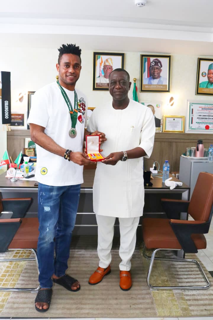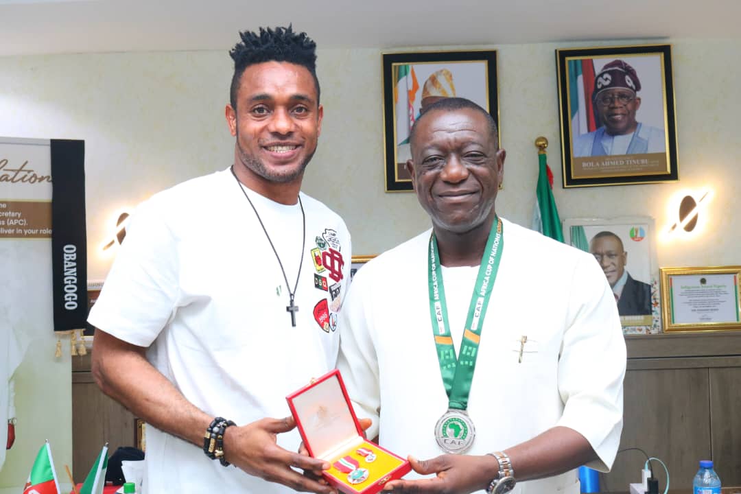 The Deputy National Publicity Secretary of the All Progressives Congress (APC), Hon Durosinmi Meseko has received one of the Super Eagles goal keeper, Ojo Olorunleke at the APC National Secretariat Abuja, following their silver medal-winning campaign at the Africa Cup of Nations (AFCON) in Côte d’Ivoire.