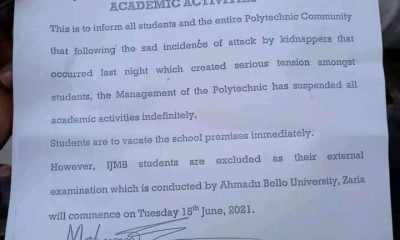 The management of the Nuhu Bamali Polytechnic in Kaduna State, on Friday announced the indefinite suspension of academic activities in the institution. A memo signed by...