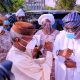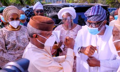 L-R: Lagos State Governor, Mr. Babajide Sanwo-Olu (right), exchanging pleasantries with Vice President, Prof. Yemi Osinbajo while his wife, Dolapo (left) and others watch with admiration...