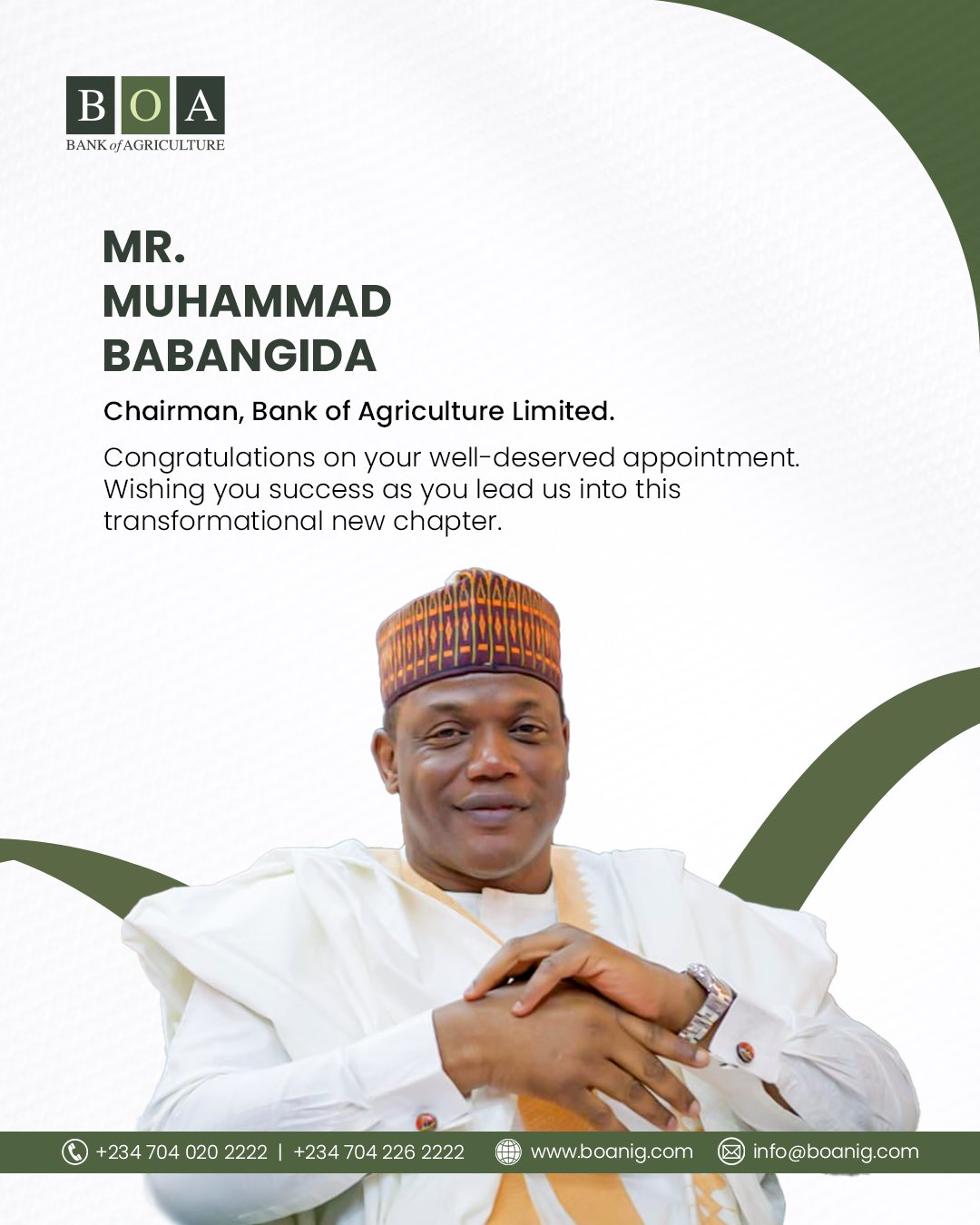 The Bank of Agriculture (BOA) has extended its heartfelt congratulations to Mr. Muhammad Babangida on his appointment as the new Chairman of the institution by President Bola Ahmed Tinubu, GCFR.