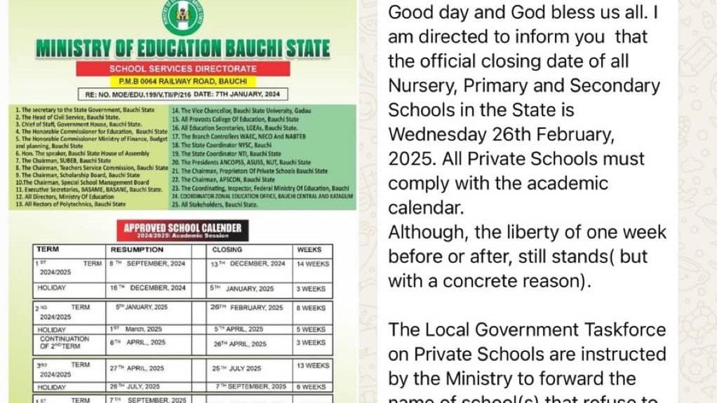 The directive, which was contained in a circular sent to private schools, stated that the closure would commence on February 26, 2025, and last until April 5, 2025.