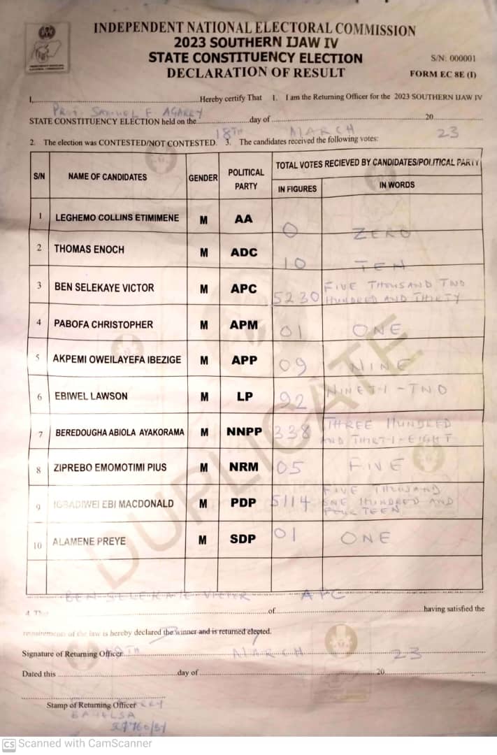 The Independent National Electoral Commission (INEC) has declared Chief Dr. Selekaye Victor Ben of the All Progressives Congress APC as the winner of Bayelsa State House of Assembly Southern Ijaw Constituency IV.