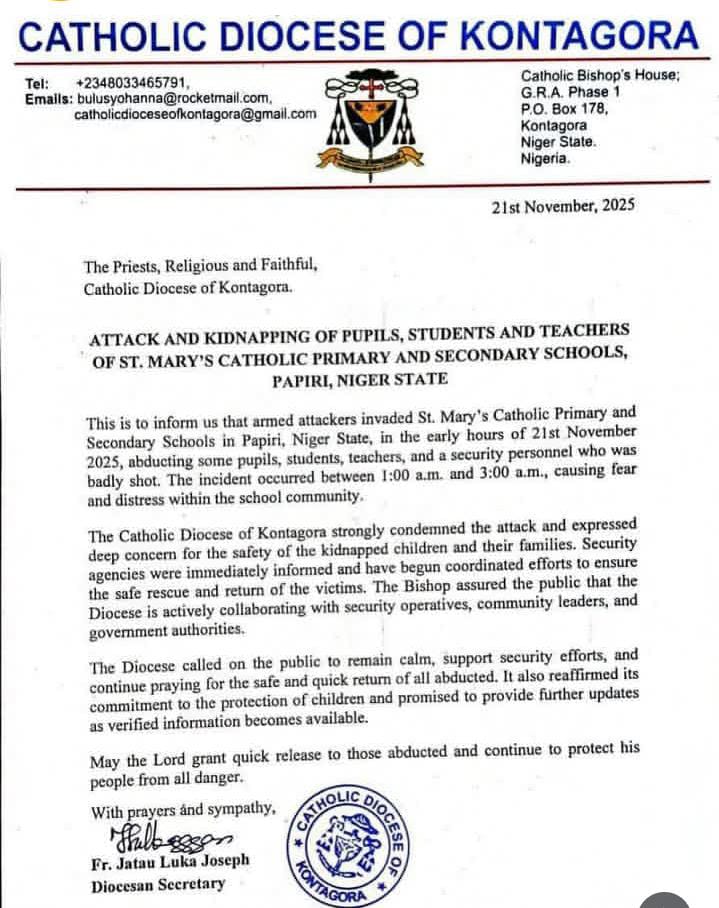 Terrorists abducted more than 52 students and teachers from St. Mary’s Papiri Private Catholic Secondary School in Papiri, Agwara Local Government Area of Niger State, in an early-morning attack on Friday, November 21. The invasion occurred between 2:00 a.m. and 3:00 a.m., marking a major security incident just five days after the school attack in Kebbi State.