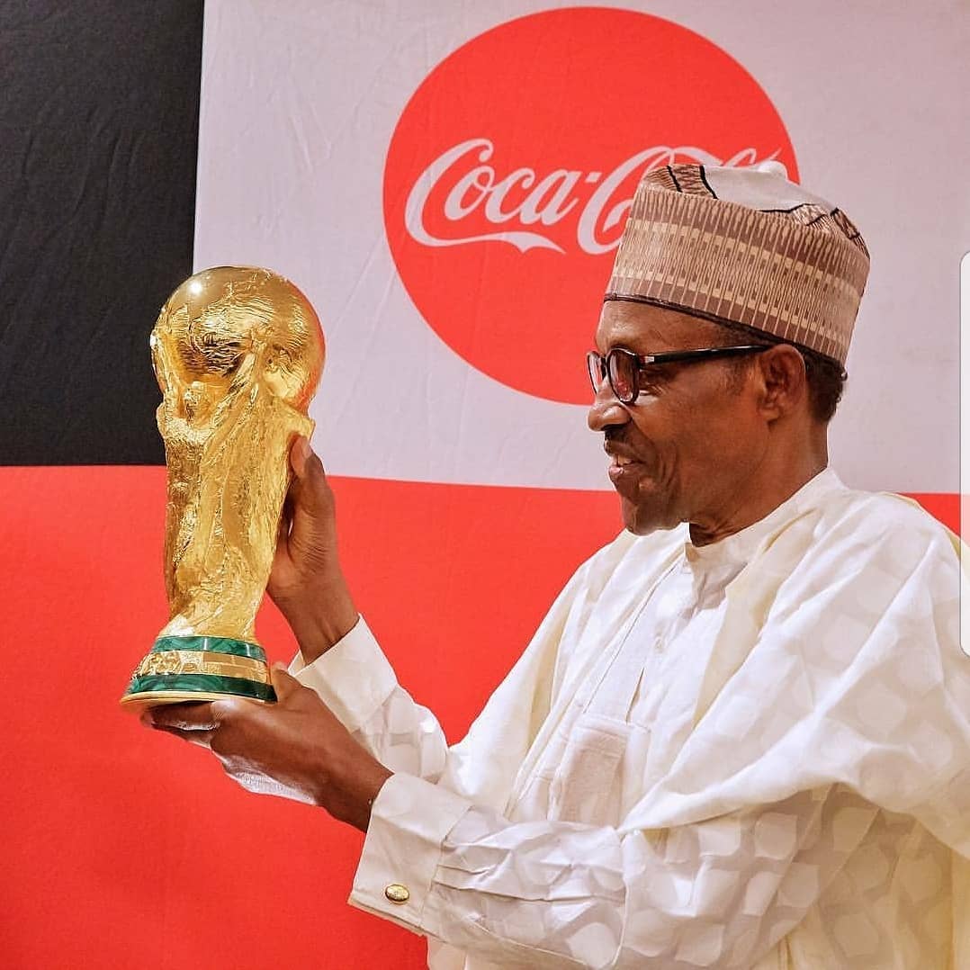 President Muhammadu Buhari receovimg the FIFA/Cocacola World Cup Trophy during a reception at the State House, Abuja. Photo by Abayomi Adeshida