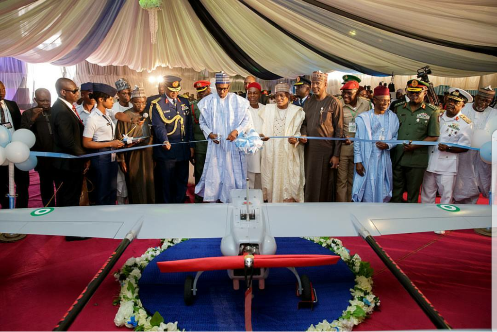 Buhari also inductef the Nigeria Air Force ‘TSAIGUMI’ Unmanned Aerial Vehicle, UAV, into service at the Nigerian Air Force Base.