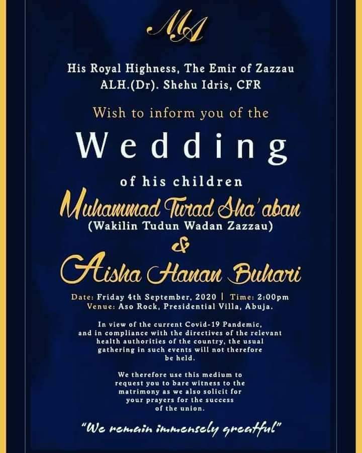 Plans are currently in top gear for the wedding of a daughter of President Muhammadu Buhari, Aisha Hanan with the love of her life, Muhammad Turad Shaabau (Wakilin Tudun Wada Zazzau) on Friday 4th September, 2020 by 2:00 pm at Aso Rock Villa, Abuja.