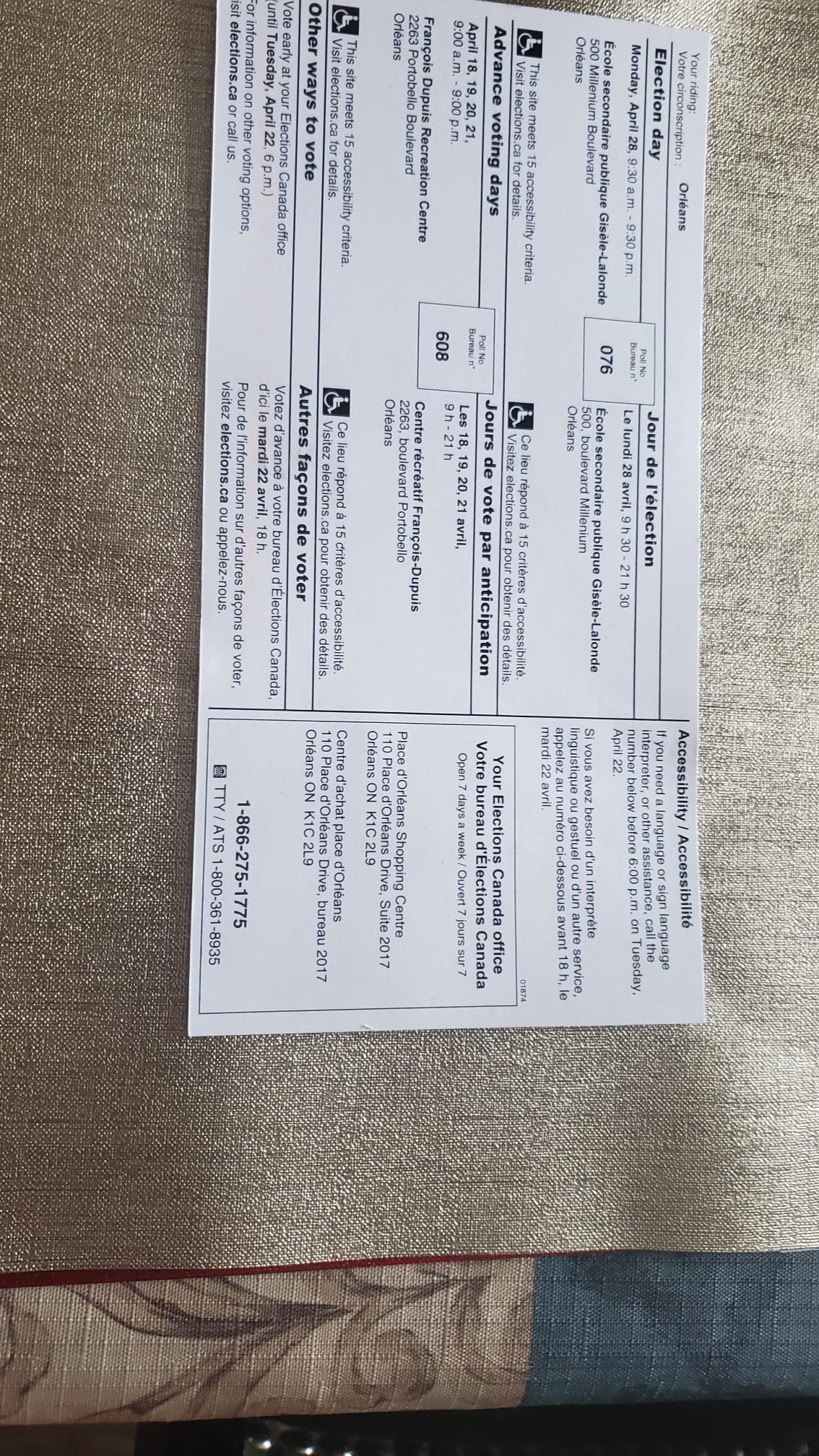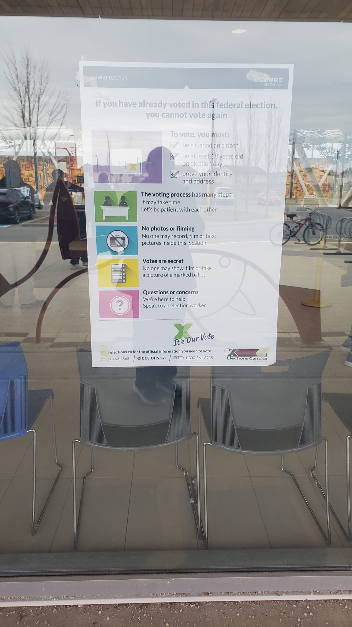 In Ottawa, our correspondent visited the François Dupuis Recreation Centre at 2263 Portobello Boulevard in the suburb of Orléans. Arriving at 3:39 p.m. and casting his ballot just seven minutes later, he found the process smooth, efficient, and quintessentially Canadian polite, organized, and hassle-free.