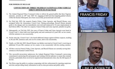The Ashanti Regional Police Command in Ghana has confirmed the conviction of three Nigerian nationals for engaging in a series of vehicle thefts within the Kumasi...