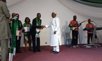 Photo R-L: Chief Segun Osoba, former Governor of Ogun State presenting the muffler and certificate of membership to Mikail Mumuni