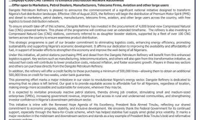 Dangote Petroleum Refinery is pleased to announce the commencement of a significant national initiative designed to transform Nigeria’s fuel distribution landscape. Effective 15th of August 2025,...