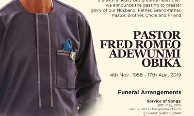 The remains of renowned journalist and Pastor of the Redeemed Christian Church of God, Fred Adewunmi Romeo Obika, will be committed to mother earth on Friday,...