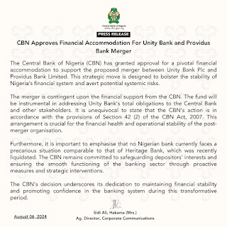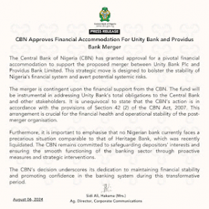 The statement read, “The Central Bank of Nigeria has granted approval for a pivotal financial accommodation to support the proposed merger between Unity Bank Plc and Providus Bank Limited. This strategic move is designed to bolster the stability of Nigeria’s financial system and avert potential systemic risks.