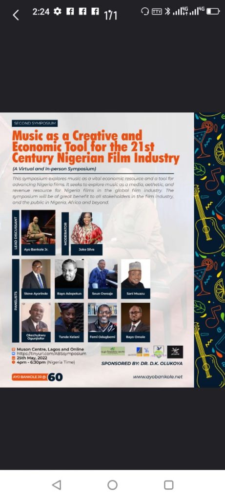 For the second symposium holding at the same venue from 4pm to 6:30pm, with the theme, ‘Music as a Creative and Economic Tool for the 21st century Nigerian Film Industry’, the celebrant Ayo Bankole Jr. is billed to be the lead discussant, with Nollywood legend, Joke Silva moderating. The panellists include celebrated film-maker, Tunde Kelani, Bayo Adepetun, Seun Owoaje, Sani Muazu, Okechukwu Ogunjiofor, Steve Ayorinde and Bayo Omole.