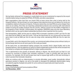 “Both organisations claim that they can import PMS at lower prices than what is being sold by the Dangote Refinery. We benchmark our prices against international prices and we believe our prices are competitive relative to the price of imports. If anyone claims they can land PMS at a price cheaper than what we are selling, then they are importing substandard products and conniving with international traders to dump low-quality products into the country, without concern for the health of Nigerians or the longevity of their vehicles. Unfortunately, the regulator (NMDPRA) does not even have laboratory facilities which can be used to detect substandard products when imported into the country.