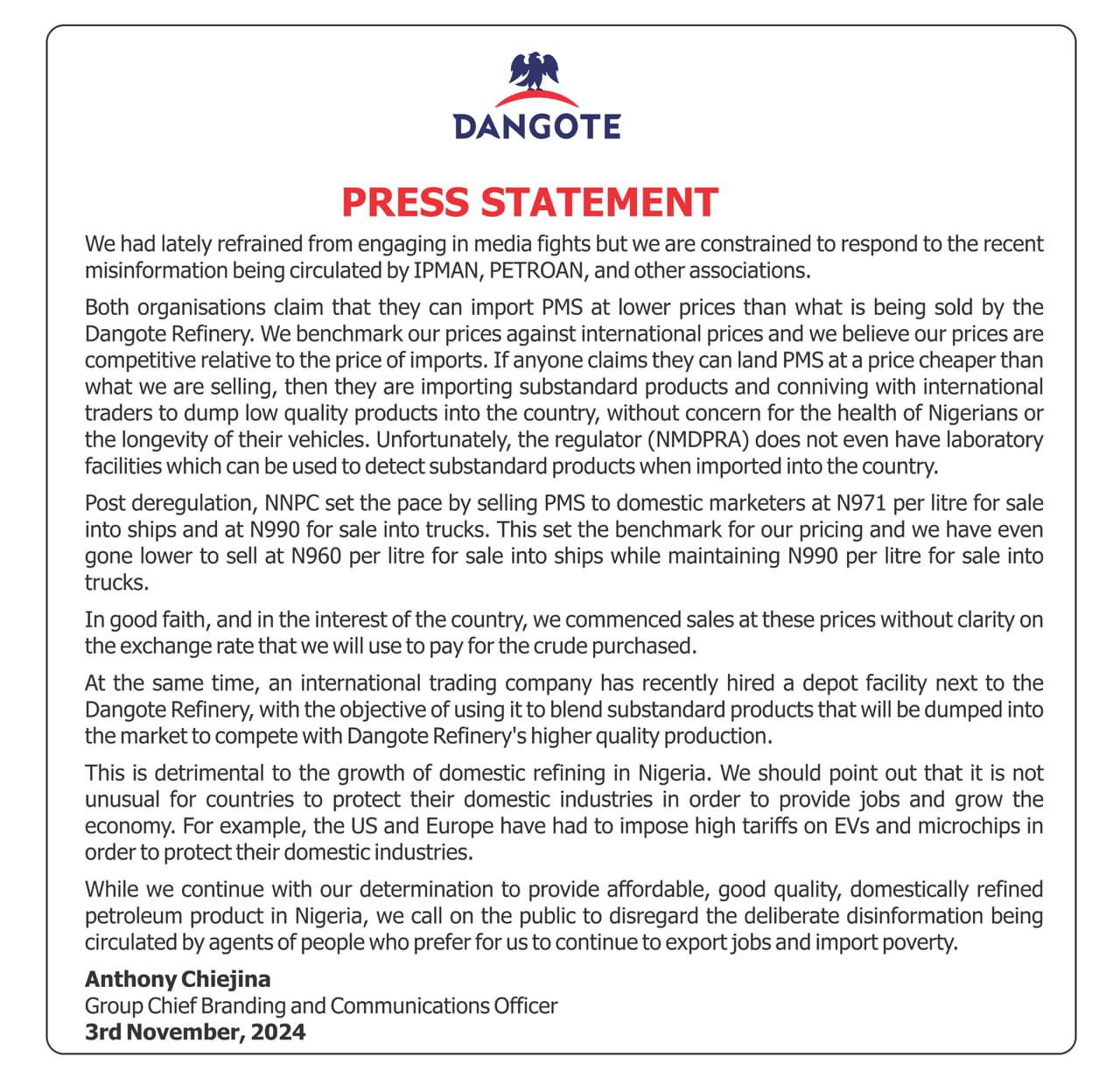 Dangote Refinery has accused the Independent Petroleum Marketers Association of Nigeria (IPMAN) and Petroleum Products Retail Outlets Owners Association of Nigeria (PETROAN) of spreading misinformation regarding petrol pricing and quality.