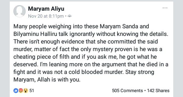 “Many people weighing into these Maryam Sanda and Bilyaminu Halliru talk ignorantly without knowing the details. There isn’t enough evidence that she committed the said murder, matter of fact the only mystery proven is he was a cheating piece of filth and if you ask me, he got what he deserved. I’m leaning more on the argument that he died in a fight and it was not a cold blooded murder. Stay strong Maryam, Allah is with you.” she wrote.