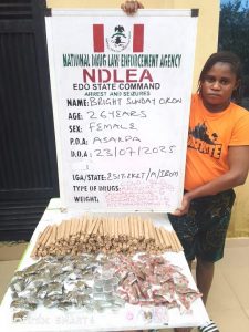 In Edo state, NDLEA officers on Wednesday 23rd July raided the Asakpa community in Benin city, where they arrested a 26-year-old lady Bright Sunday Okon and recovered various quantities of Colorado, Loud, Arizona and skunk, all strains of cannabis as well as Methamphetamine from her.