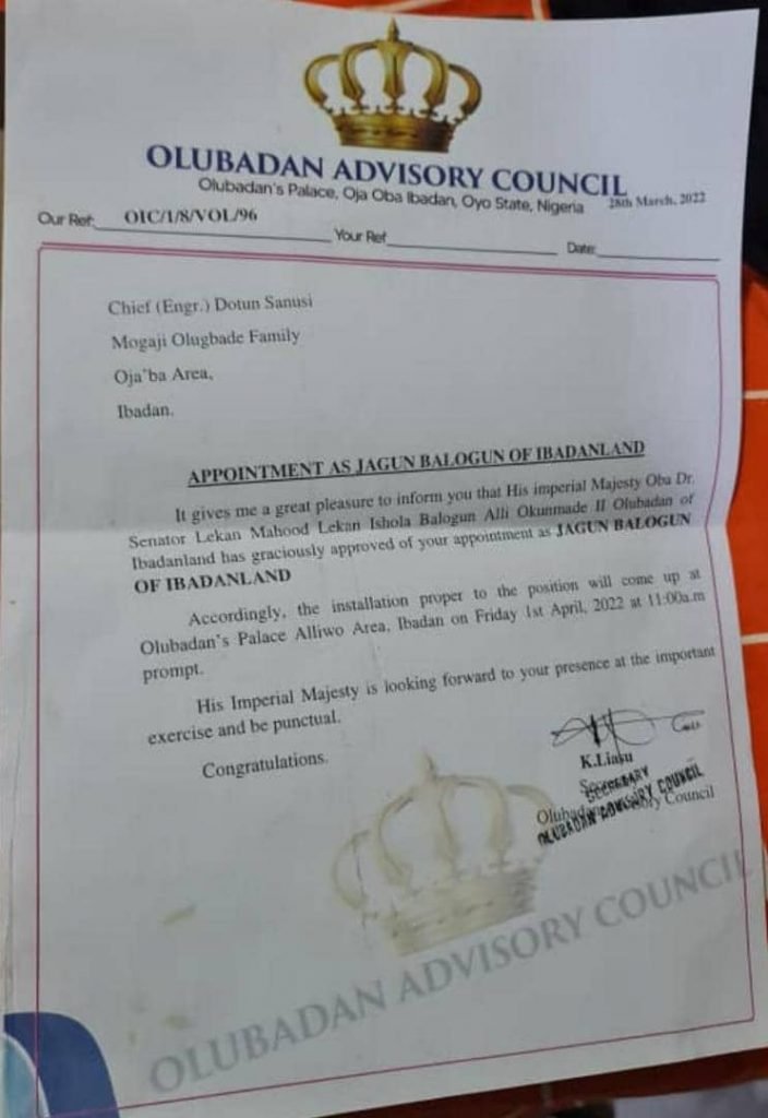 Our correspondent gathered that Chief Remi Ibrahim Babalola and Dotun Sanusi have been issued letters of appointment as Jagun Balogun of Ibadanland.