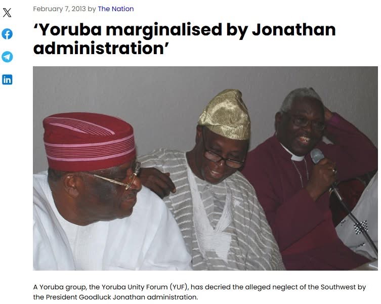 The Jonathan Era: A Data-Driven Exclusion of the Yoruba. Under President Goodluck Jonathan (2010–2015), the Yoruba were systematically sidelined from Nigeria’s power structure. The Yoruba Unity Forum (YUF), led by Chief Olu Falae, Bishop Bolanle Gbonigi, and others, presented irrefutable evidence in 2013: