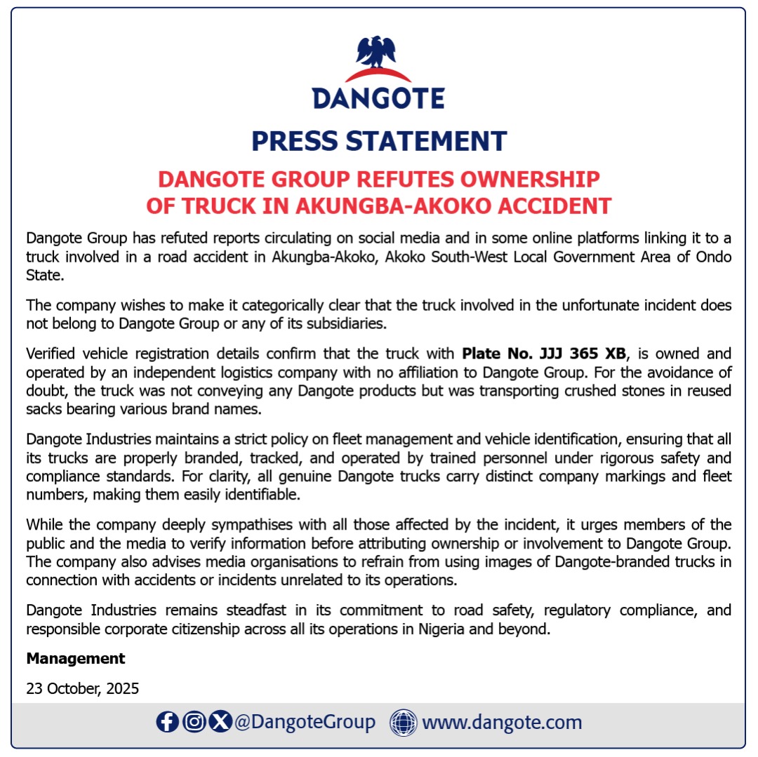 While the company deeply sympathises with all those affected by the incident, it urges members of the public and the media to verify information before attributing ownership or involvement to Dangote Group. The company also advises media organisations to refrain from using images of Dangote-branded trucks in connection with accidents or incidents unrelated to its operations.