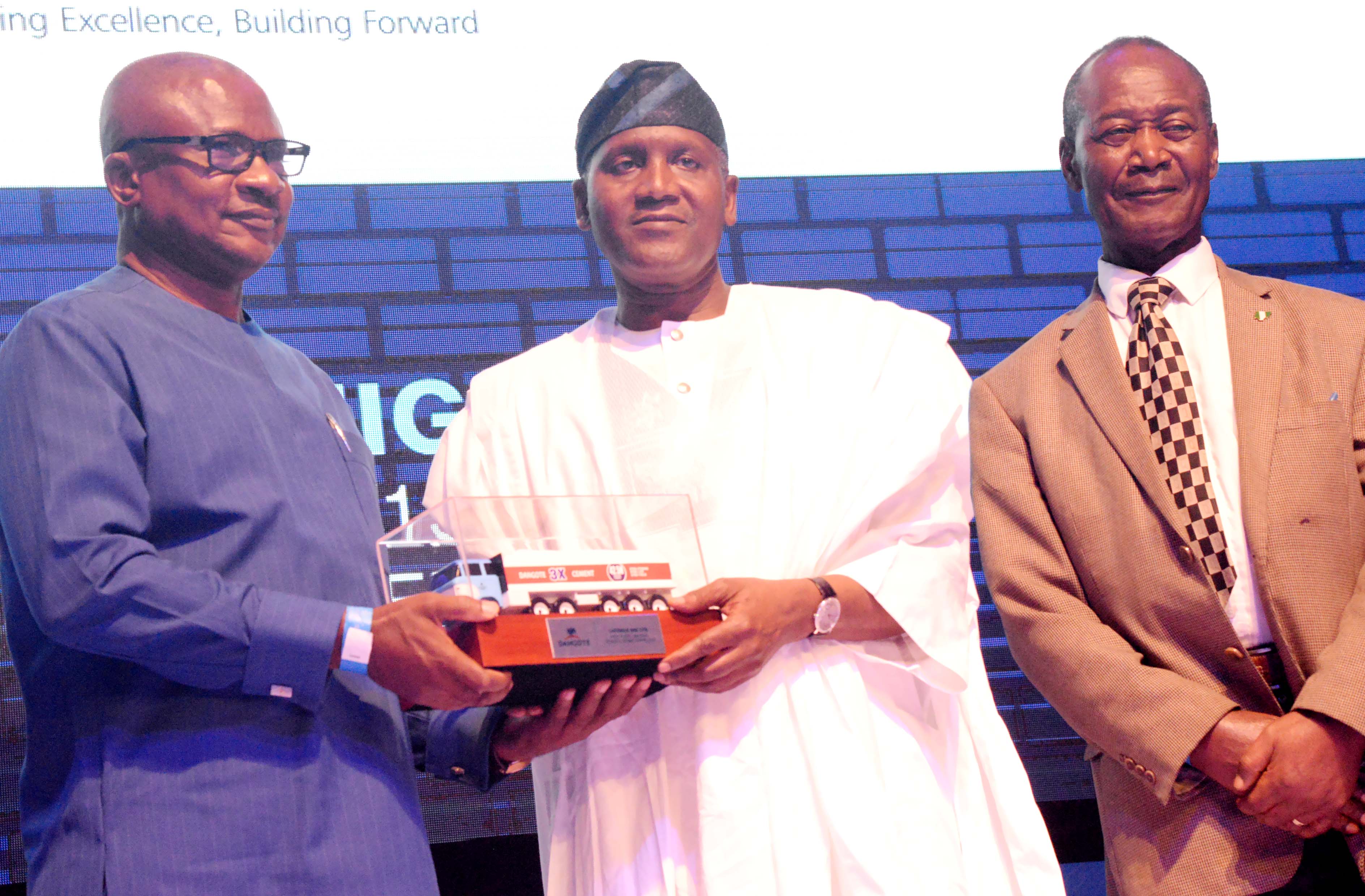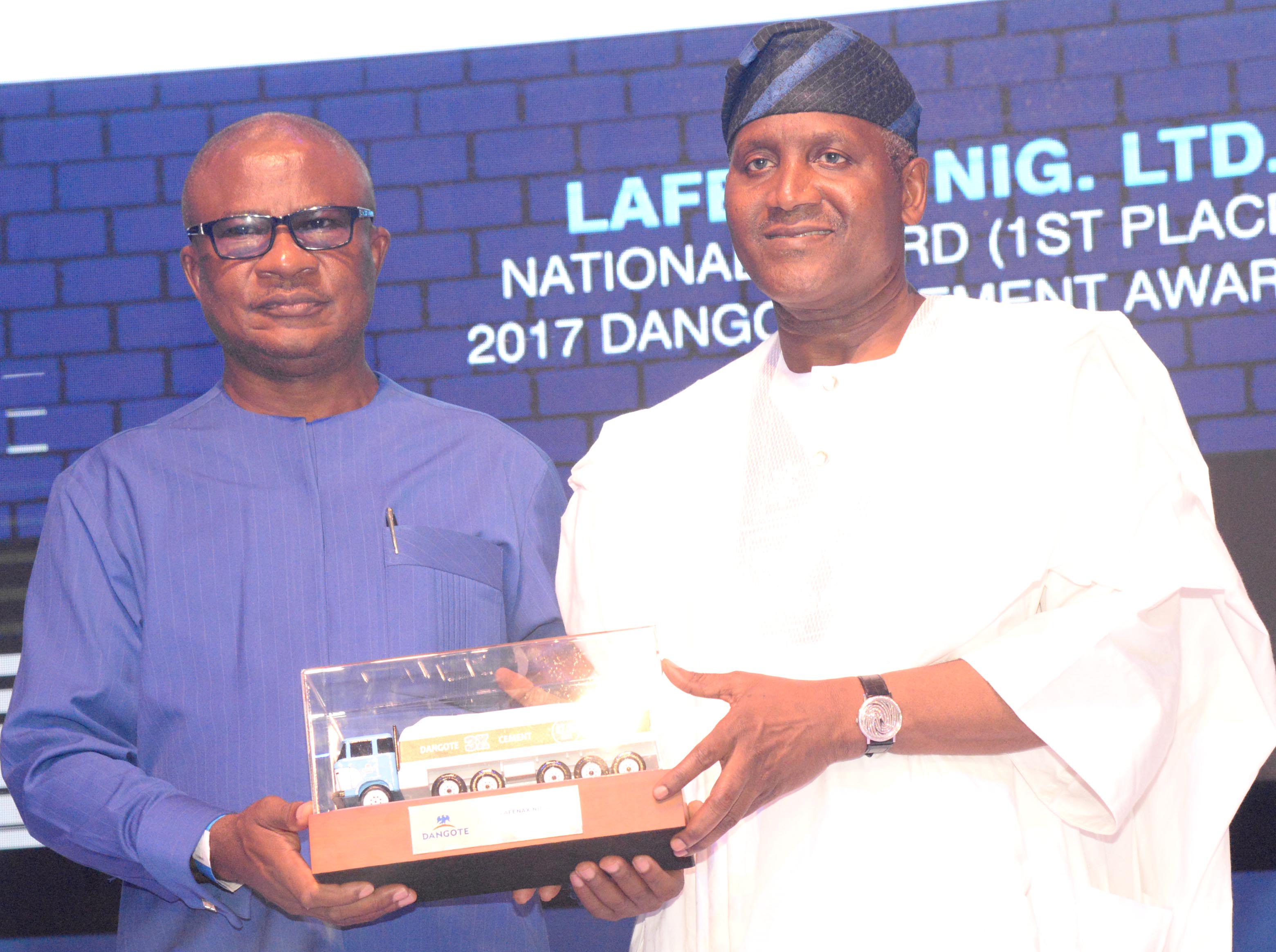 Chairman, Dangote Cement Plc, Aliko Dangote presenting the Best National Distributor award to Mr Onyemelukwe Ifenchor, MD of Lafenax Nig. Ltd, at the Dangote Cement Plc Distributors Awards and Gala Nite