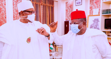 A photo taken on January 11, 2022, shows President Muhammadu Buhari exchanging pleasantries with Ebonyi State Governor, David Umahi, at the State House in Abuja.