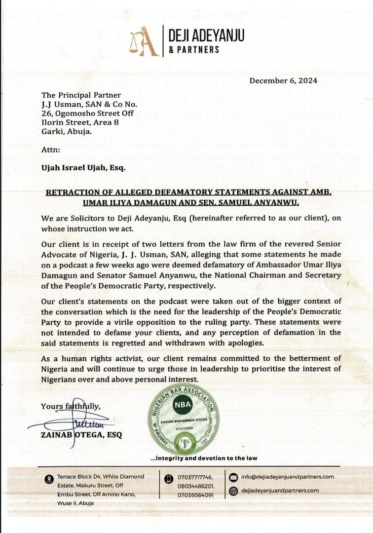 Deji Adeyanju, a human rights activist, has issued a public apology and retraction of his previous defamatory statements against Ambassador Umar Damagum, the Acting National Chairman of the Peoples Democratic Party (PDP), and Senator Samuel Anyanwu, the National Secretary.