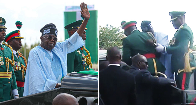 Tinubu missed a step while climbing the vehicle for a parade at Eagle Square in Abuja during an event for the 2024 Democracy Day. But he quickly regained his balance and continued with the activities for the day.