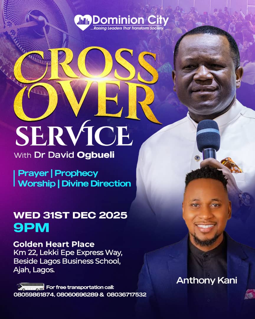 The Crossover Service will be ministered by Dr. David Ogbueli, Founder and President of Dominion City, widely known for his prophetic insight, leadership teachings, and transformational ministry across Africa and beyond. The service promises a spiritually charged atmosphere focused on reflection, thanksgiving, prophetic declarations, and strategic alignment for the coming year.