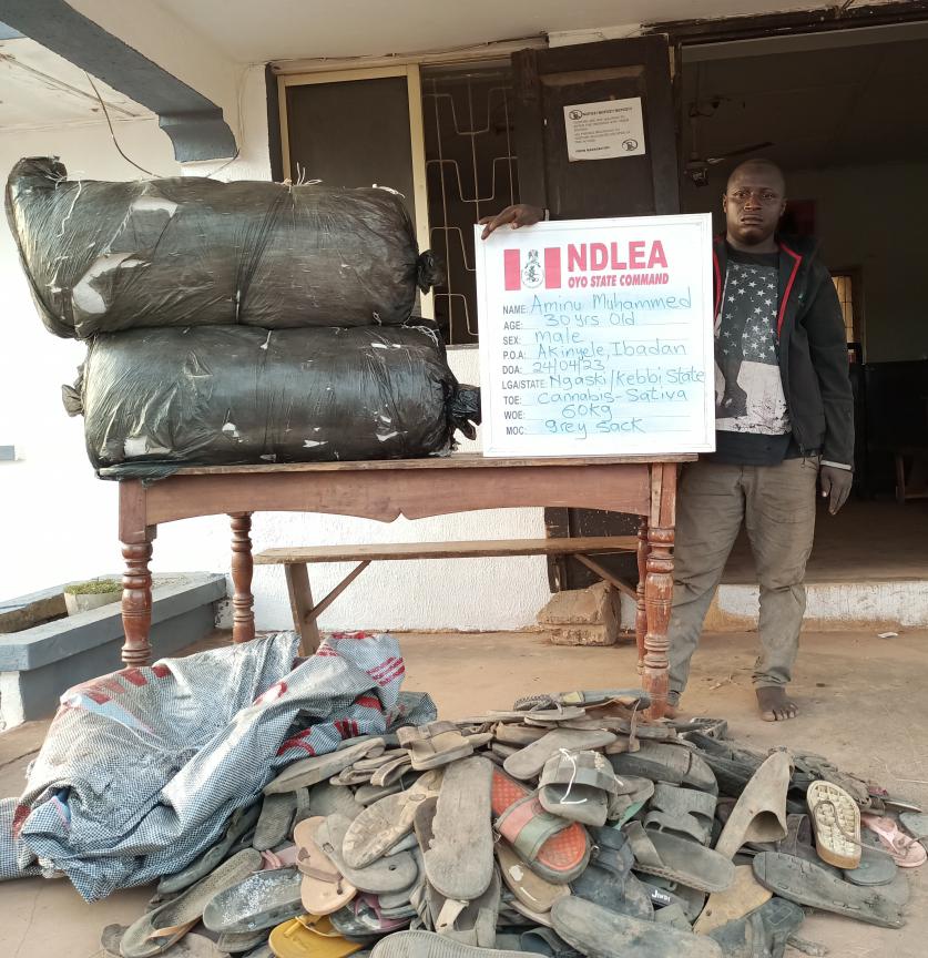 No fewer than seven bags of cannabis with a gross weight of 74.5kg were recovered when operatives raided an uncompleted building located in a bush in Ala town, Akure area of Ondo state just as 60kg of the same substance concealed among footwears in two jumbo sacks was recovered from one Aminu Mohammed along Ibadan – Oyo road, Oyo state while waiting to board a vehicle to Kebbi State.
