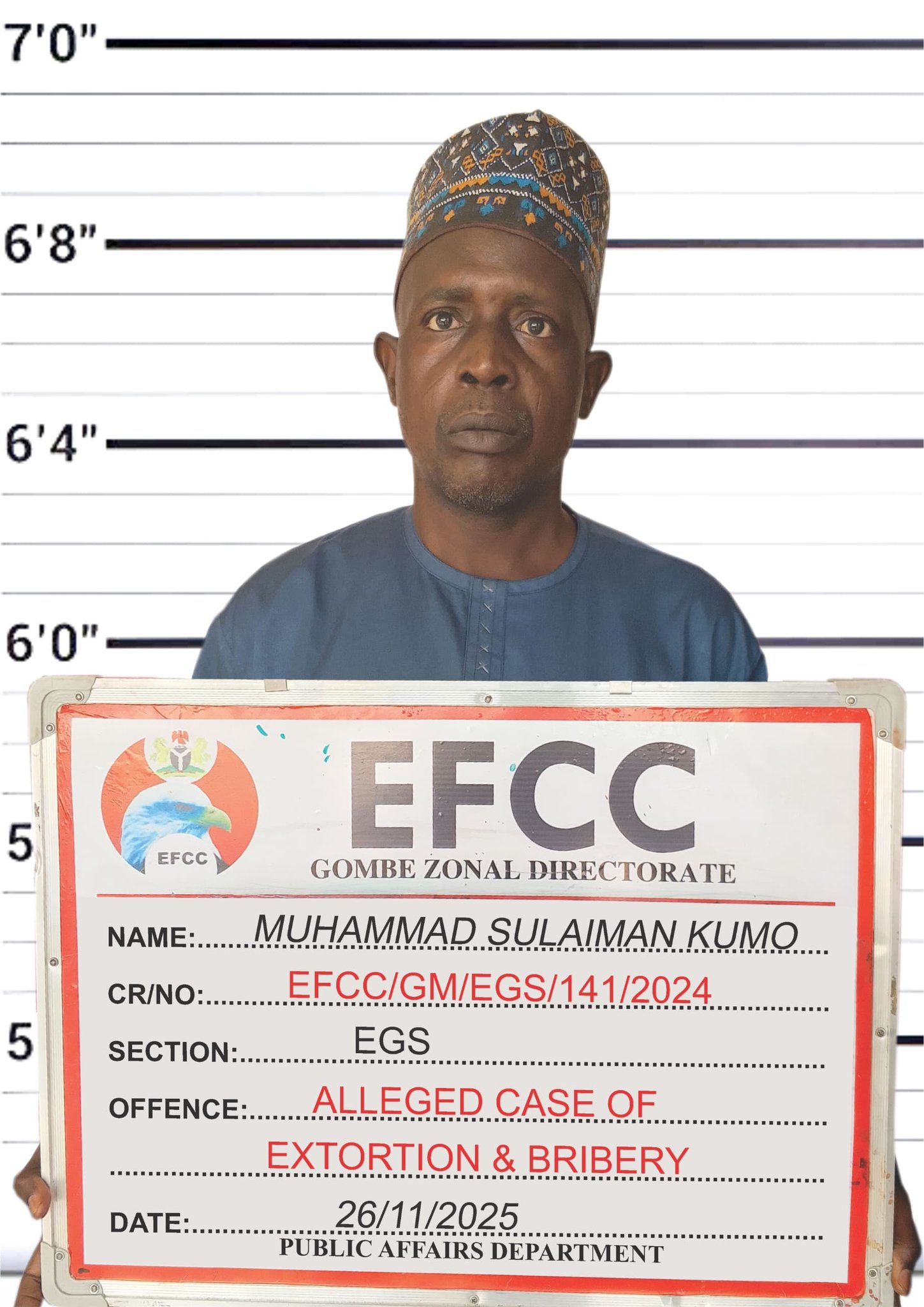 The Economic and Financial Crimes Commission (EFCC), on December 3, 2025, arraigned Magistrate Mohammed Suleiman Kumo before Justice H.H. Kereng of the Gombe State High Court on a three-count charge bordering on bribery and extortion.