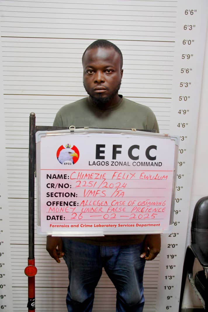 The Lagos Zonal Directorate 1 of the Economic and Financial Crimes Commission (EFCC) on Tuesday, June 3, 2025, arraigned one Ewulum Chimeze Felix on an 11-count charge bordering on obtaining money by false pretence, stealing, possession of fraudulent documents, and forgery to the tune of N23,500,280 (Twenty-Three Million, Five Hundred Naira, Two Hundred and Eighty Kobo).