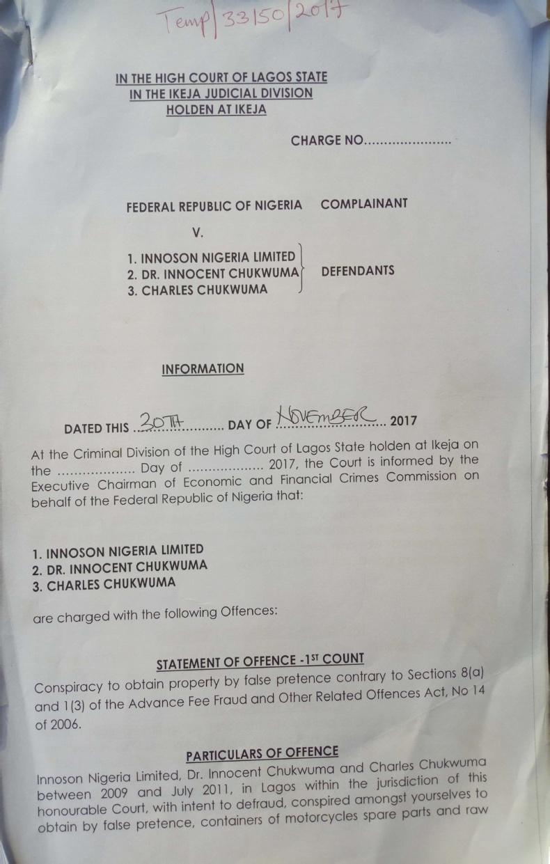 The Economic and Financial Crimes Commission (EFCC) has filed a four-count charge of conspiracy to obtain property by false pretense, obtaining property by false pretense, stealing and forgery against Mr. Innocent Chukwuma, Chairman of Innoson Nigeria Limited, and his company.