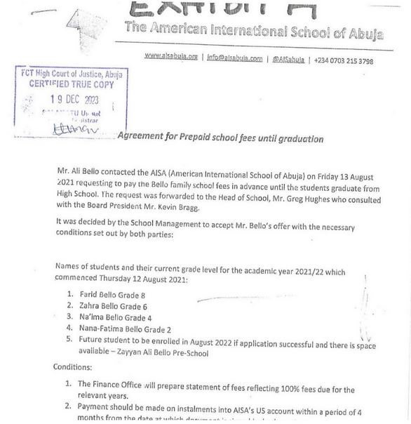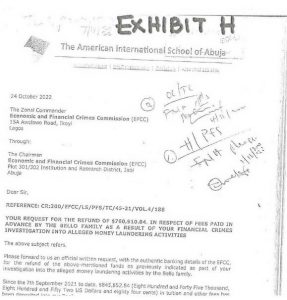 In the document, the school stated that they have deducted the fees for the educational service already rendered to the Bello children in the institution and what is left is $760, 910, which would be refunded to an account provided by the EFCC as the commission continues investigation into alleged money laundering levelled against Yahaya Bello.