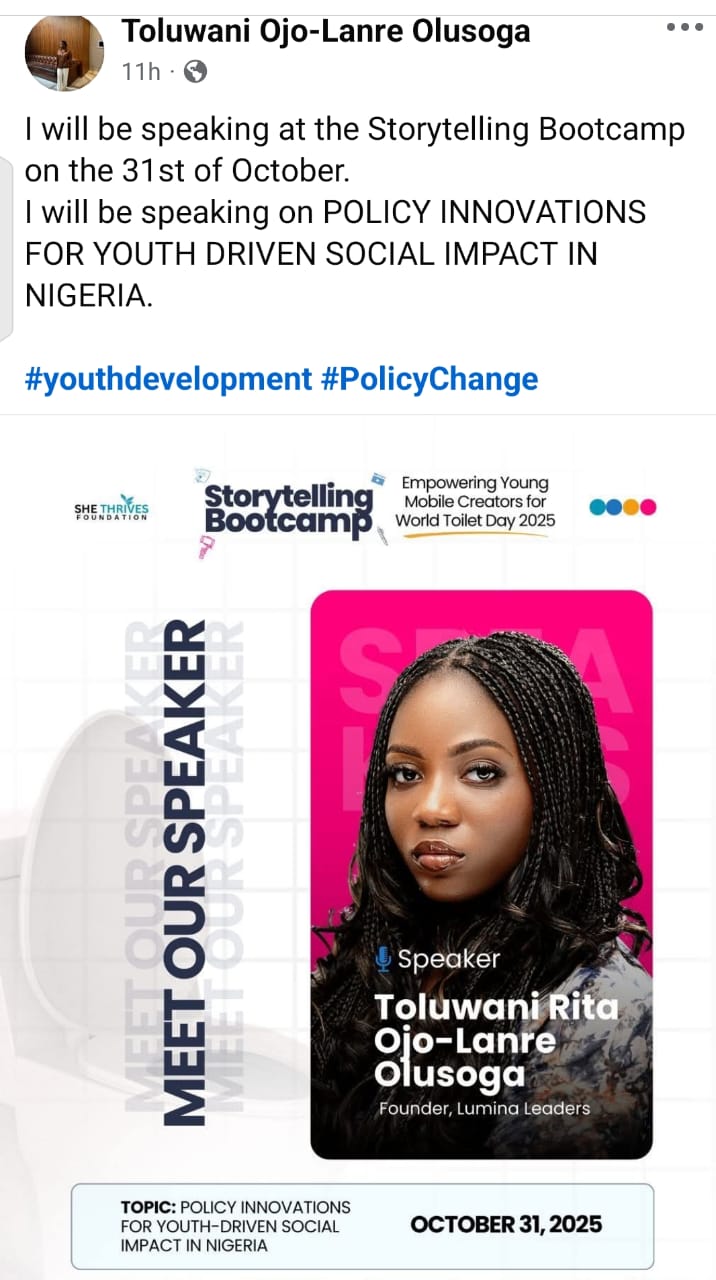 Ekiti Lady, Toluwani Rita Ojo-Lanre Olusoga, To Speak At The Storytelling Bootcamp On Policy Innovations For Youth-Driven Social Impact